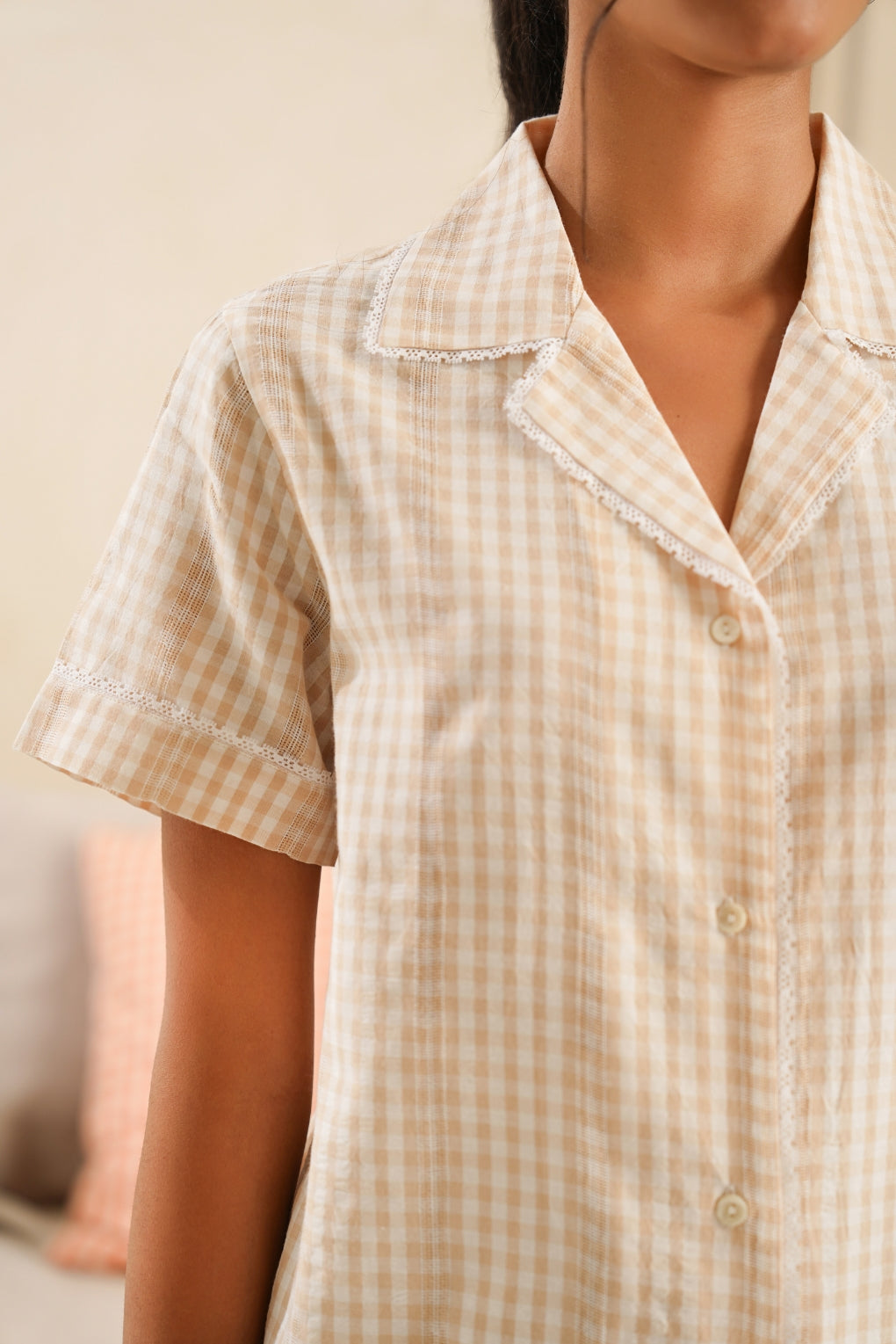 Shirt: Craftd from seersucker cotton fabric adds an airy texture, keeping it cool and fresh all day. Feels light and smooth against the skin, perfect for home or casual outings.