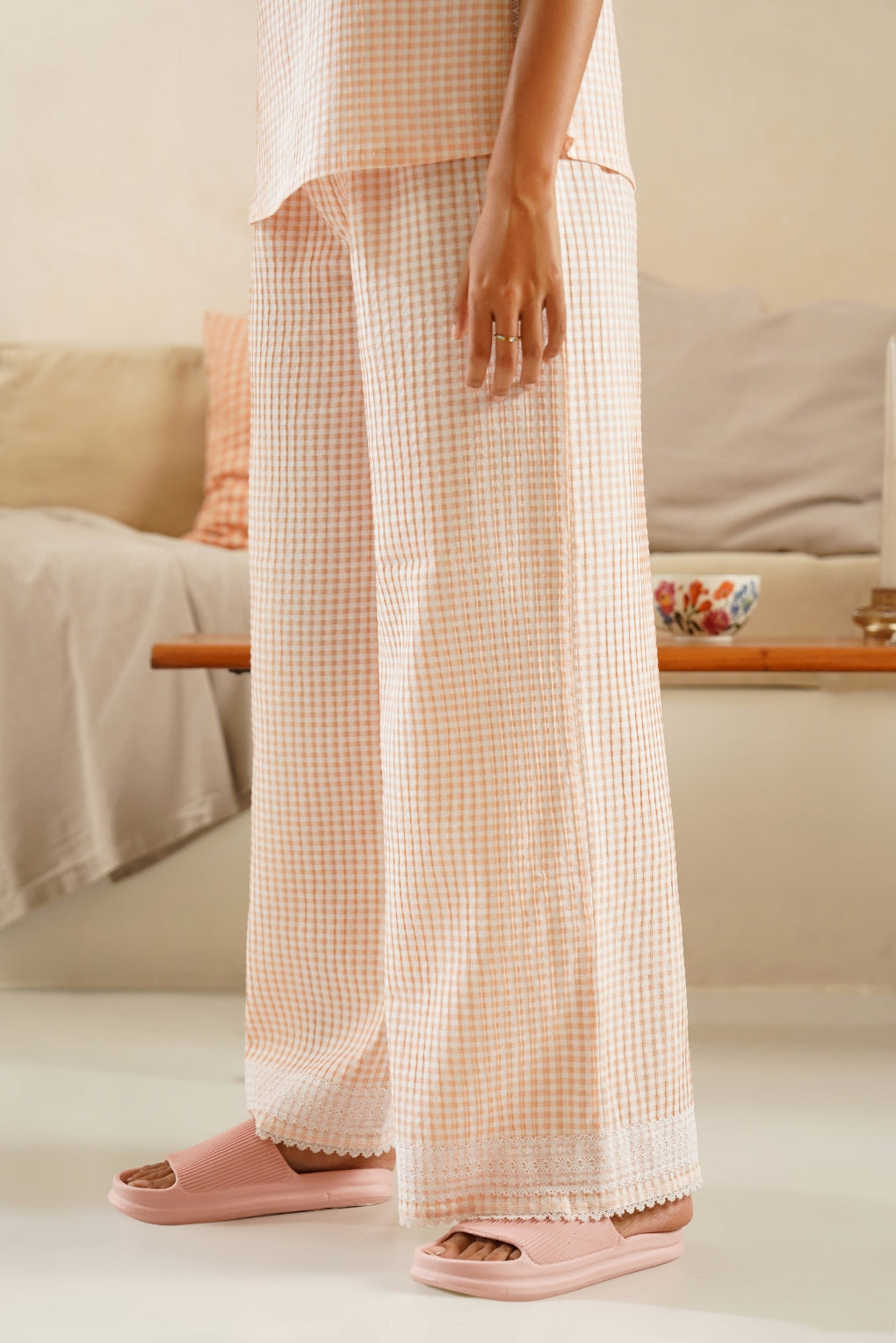 Slip into serenity with the Soleil Gingham Lounge Pants, designed for a chic and effortless nightwear look. Crafted from breathable cotton seersucker, the wide-leg silhouette ensures fluid movement, while delicate lace-trimmed hems add a touch of elegance. Finished in soft pastel gingham, these pants embody quiet luxury and timeless comfort.