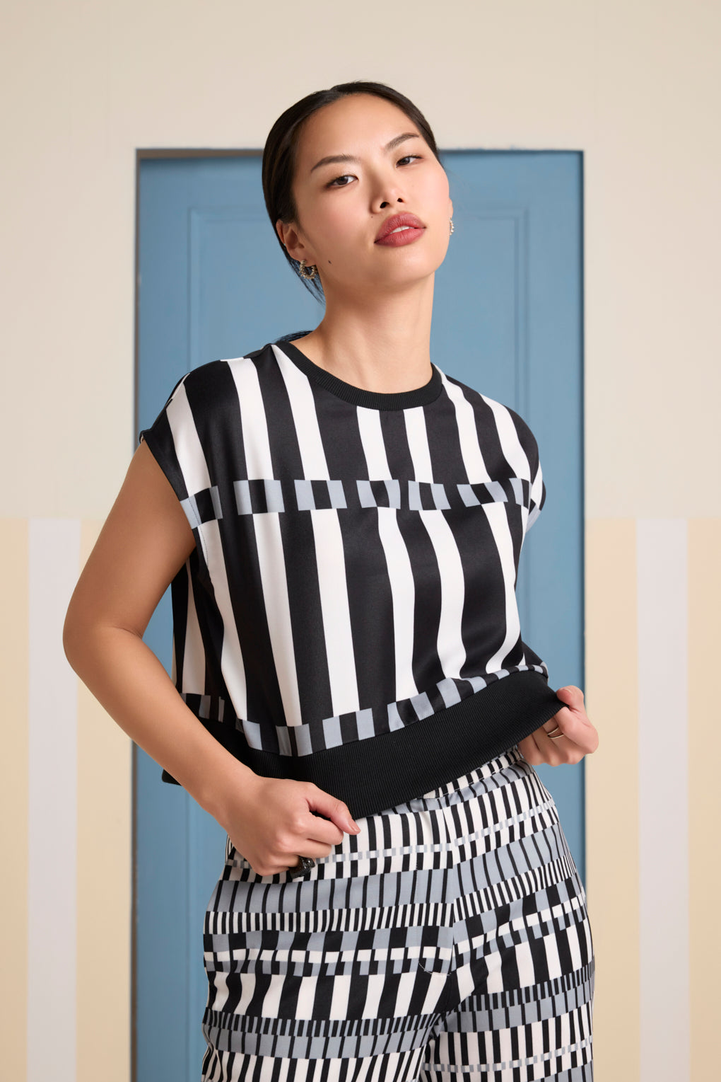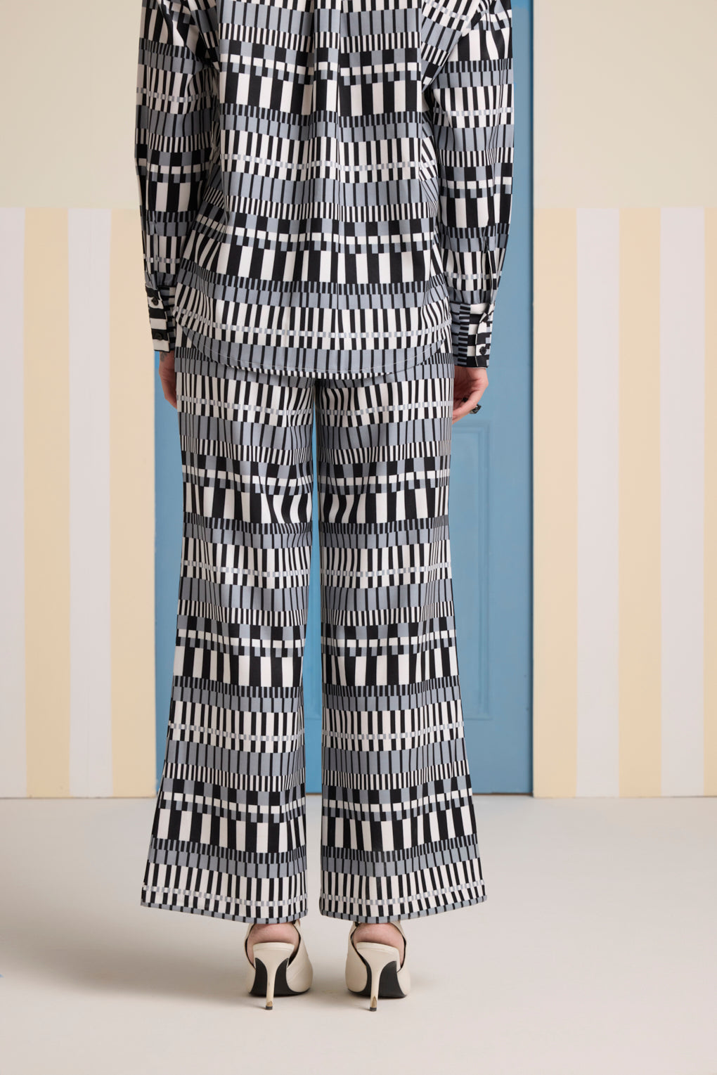 Elevate your style with this bold and vibrant co-ord set, featuring a boxy sleeveless top and matching flared pants in a striking multicolor geometric print. Designed for both comfort and effortless chic, this set is perfect for making a statement. The contrast ribbed neckline and bottom hem add definition to the relaxed top, while the regular-waisted flared pants create a flattering silhouette.