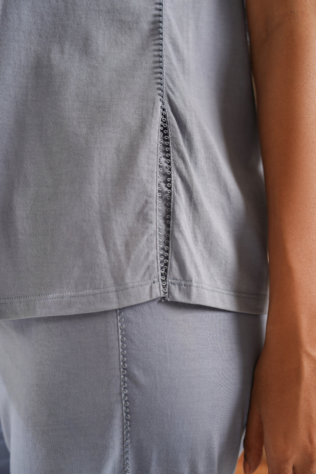 Embrace comfort with a touch of minimalism in this Nocturnal Bliss Tank Top. Designed with a flattering buttoned front, it’s perfect for lounging at home. Soft, breathable fabric ensures you stay cool and comfortable all day long. Pair it with matching pants for the ultimate relaxed look.