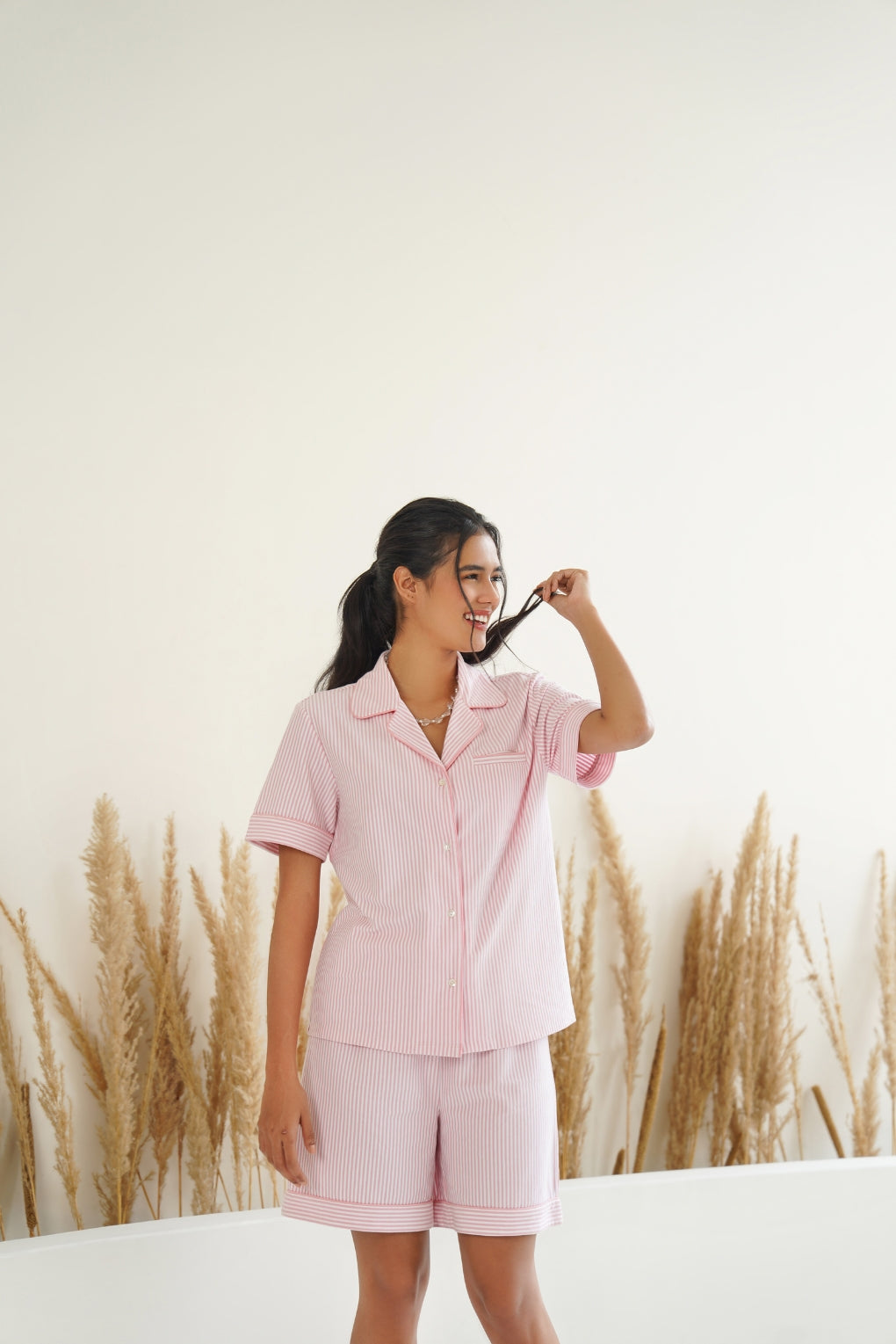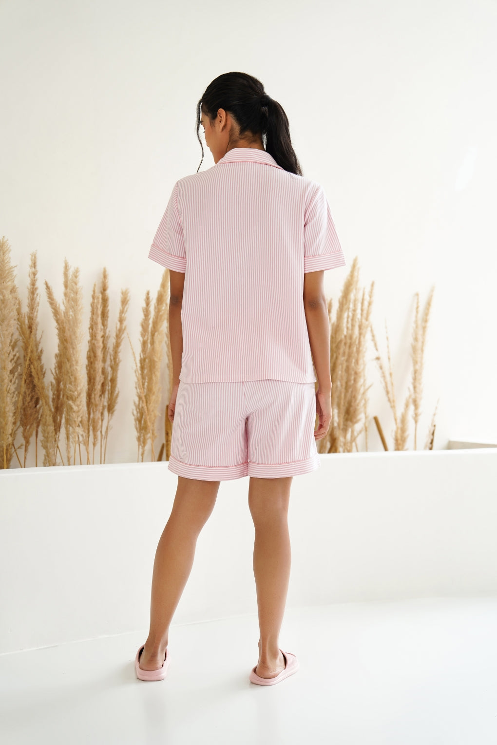 Unwind in style with this Noelle Stripe Shorts Co-ord Set. The crisp, short-sleeved top features a classic notched collar, finished with a chest pocket, while the matching shorts offer a comfortable fit with an elastic waistband. Both pieces are crafted from luxurious Y/D stripe fabric, offering a timeless pattern that adds sophistication to your night routine. Ideal for a cozy evening or a relaxed weekend morning, this set is where comfort meets chic.