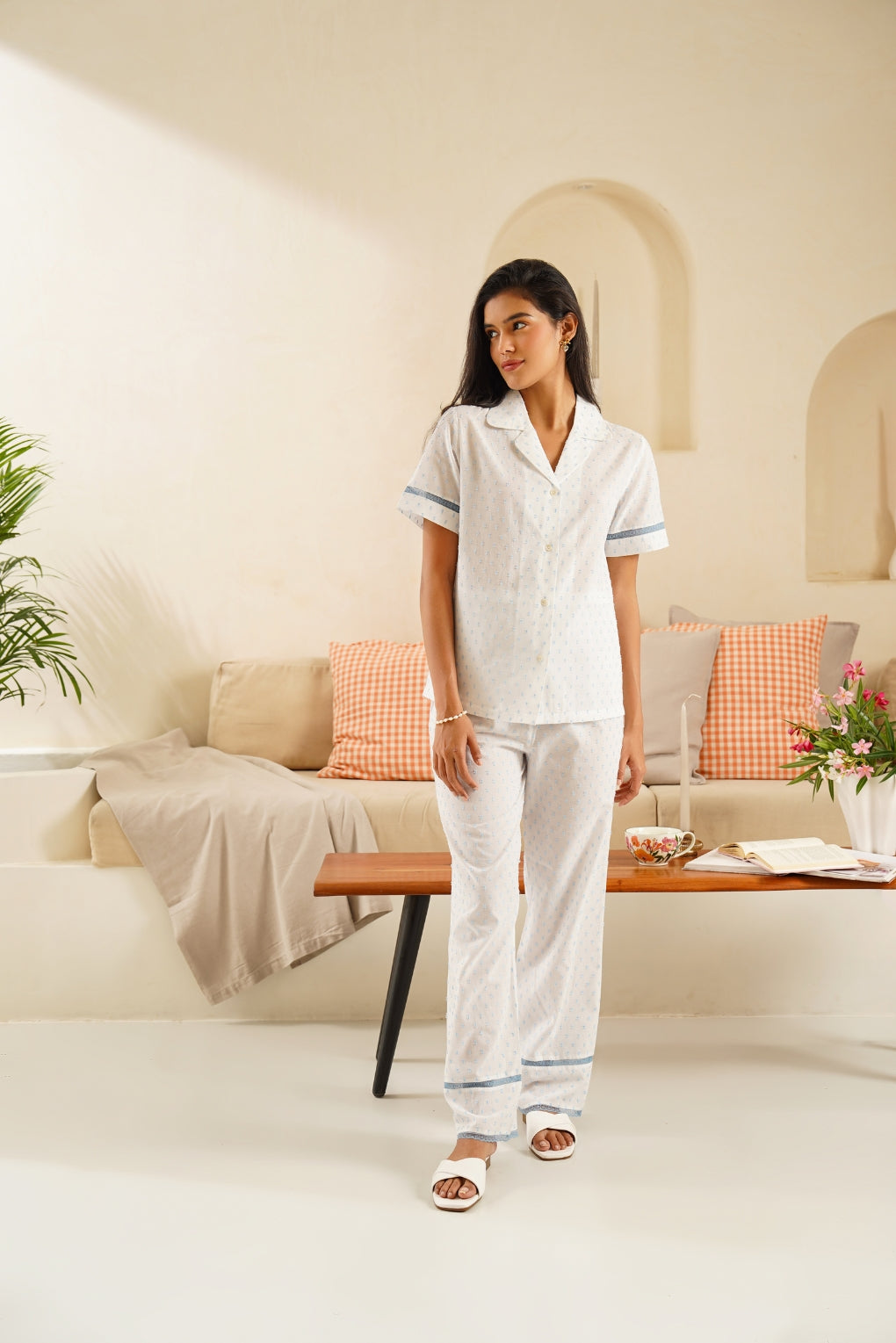 Drift into restful sleep with the Serene Slumber Pajama Pants. Crafted from breathable cotton with soft blue accents, these full-length pants provide both comfort and style. The relaxed fit and delicate details along the hem add a touch of elegance to your nightwear collection. Pair it with a cozy top for the ultimate sleepwear ensemble.